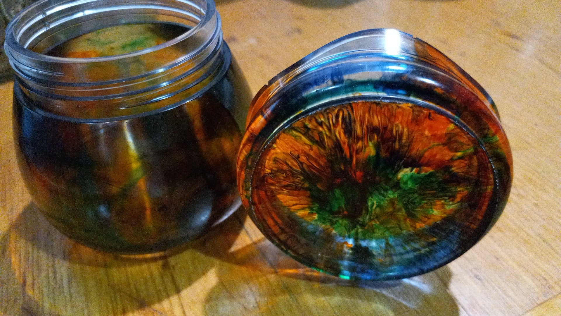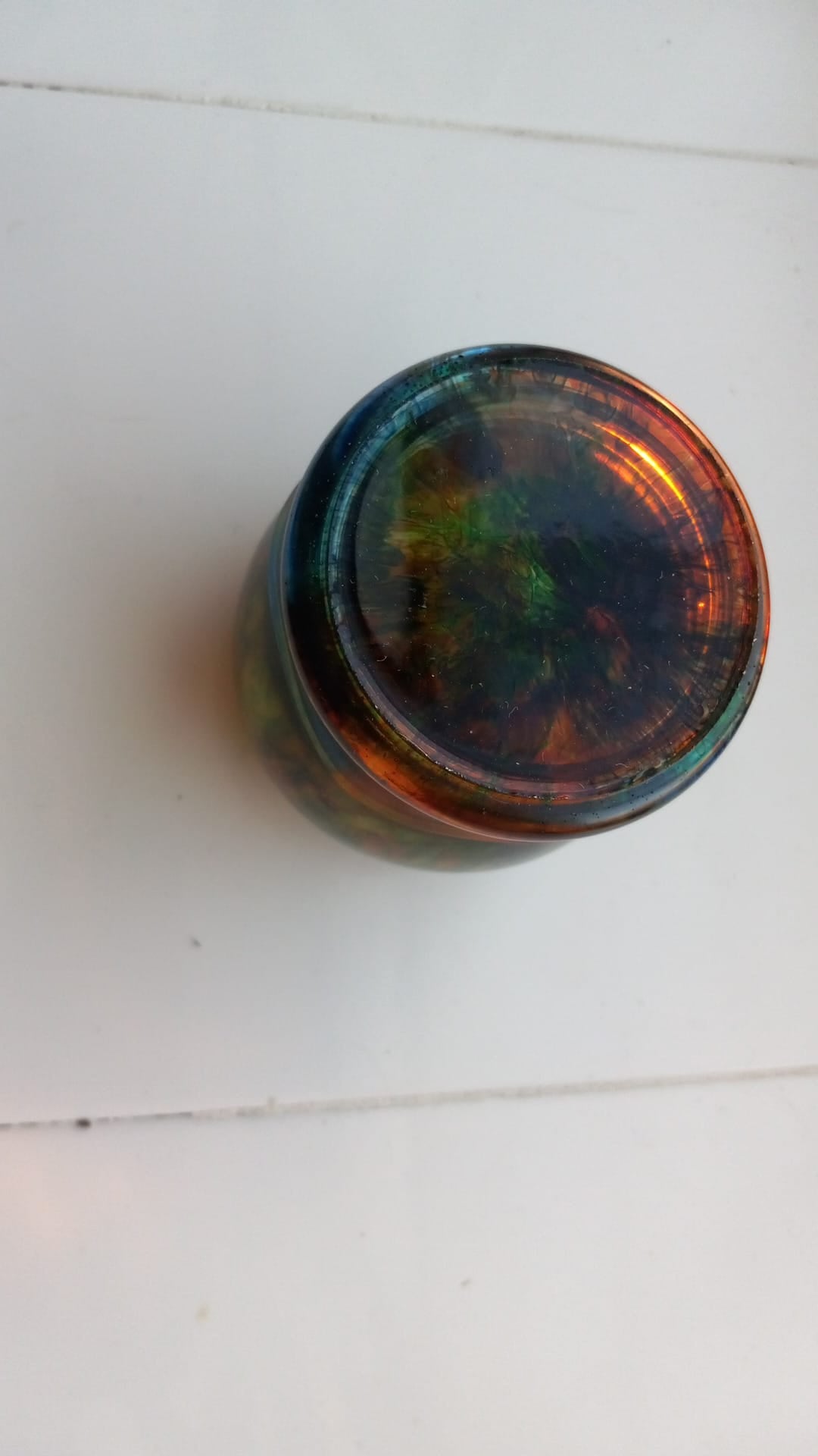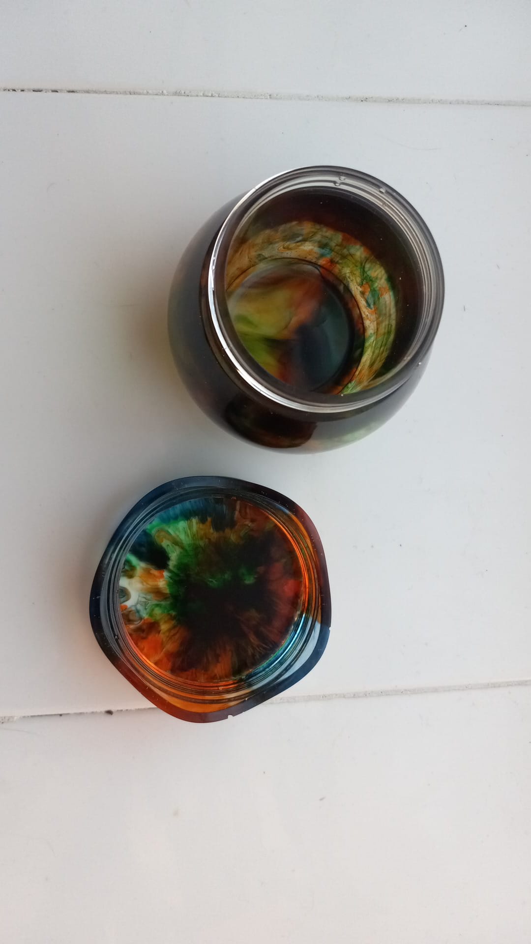 Crafted with a vibrant blend of red, orange, yellow, and green resin, the Treasure Vault jar emanates a spectrum of colors, symbolizing the diversity of treasures held within. The vivid hues create a visually striking and dynamic piece, making it both a functional storage solution and a decorative accent.