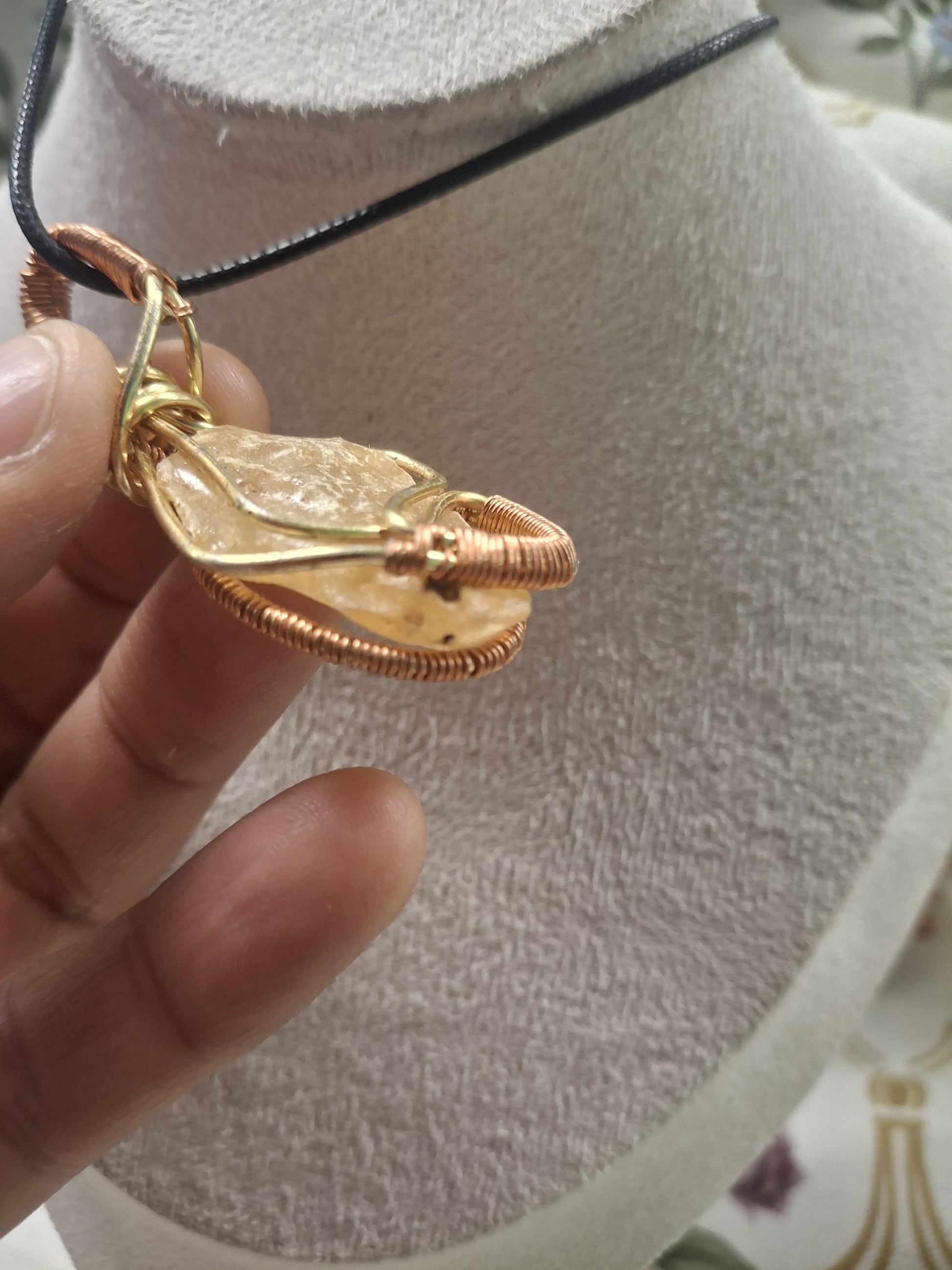 This rare Yellow Amber pendant, containing five tiny, preserved insects, is wrapped in rose and gold copper wire and finished on a 22-inch black rope necklace. Each piece is a natural time capsule—ancient, luminous, and one of a kind.
