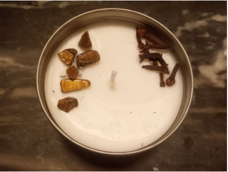 Activating the root and sacral chakra, the Strength and Courage candle harnesses the energy of the tiger eye stone with stone which means it helps you to get grounded, build a safe and strong foundation, and find your motivation once more. Paired with the Tiger's Eye is good for growing your confidence and strength and it is known as the stone of courage and Clove oil is comforting and revitalizing. It is a mental, emotional and subtle body energy tonic, restoring and stimulating all at once. It invites free, conscious choices and joyful engagement with life.